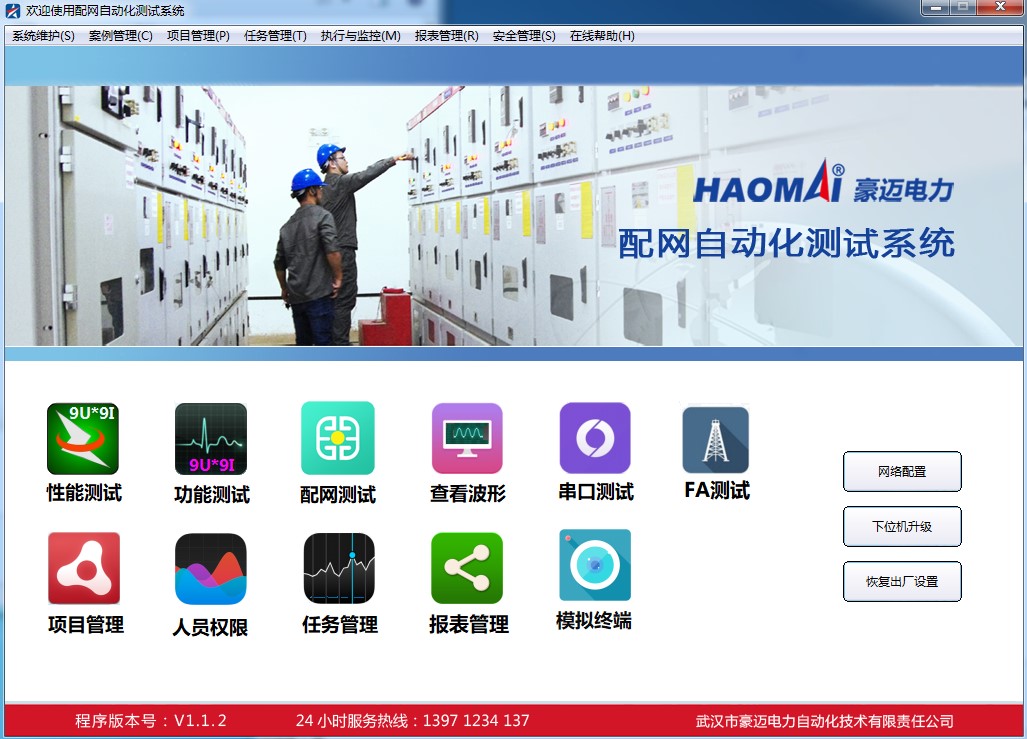 軟件主界面包含性能測(cè)試、功能測(cè)試、配網(wǎng)測(cè)試、查看波形、串口測(cè)試等功能。