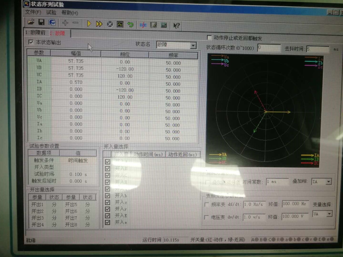 測試儀開關量輸入A端子接入裝置跳閘線圈端子口(本次選擇壓板跳閘出口)