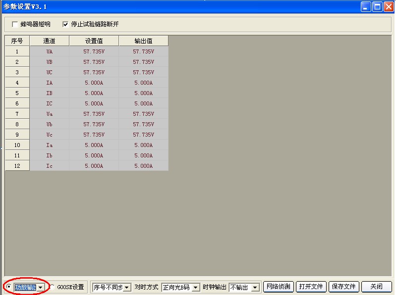 2) 點擊標題欄中“61850”按鍵,進入?yún)?shù)設(shè)置界面,選擇左下角“功放輸出”,表示繼保儀輸出為模擬量電流電壓信號,然后直接點擊右下角關(guān)閉即可。