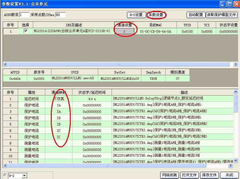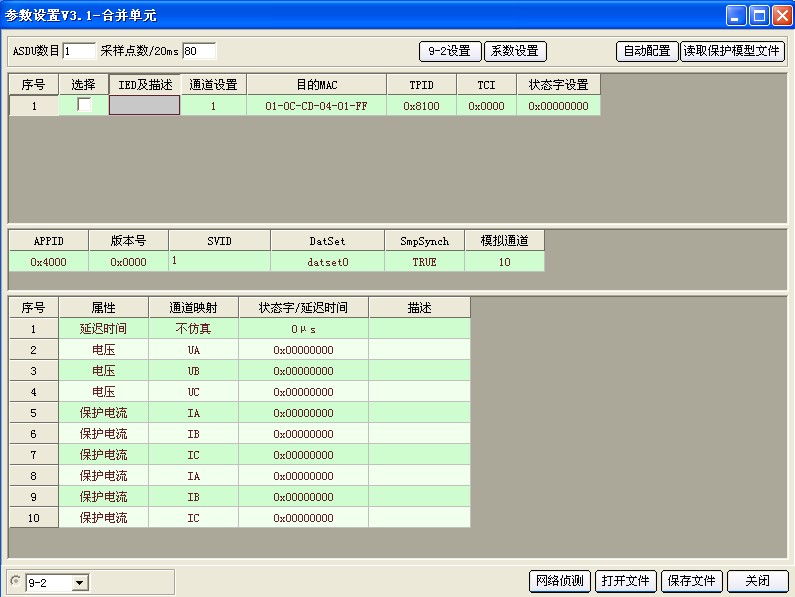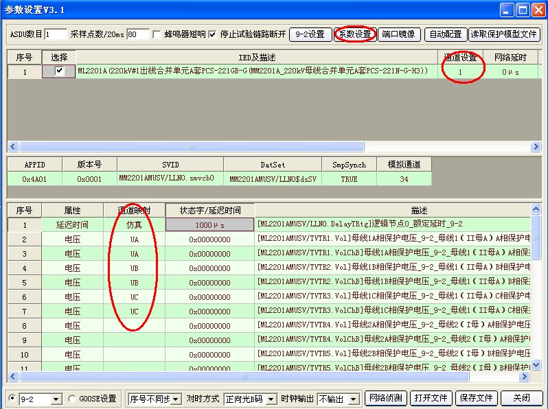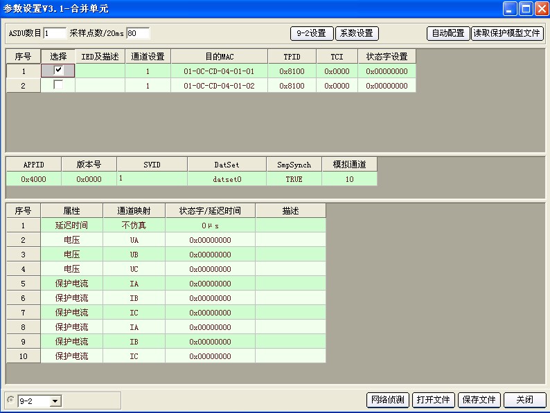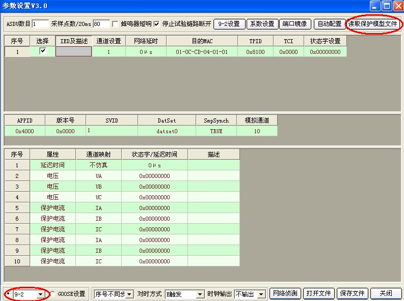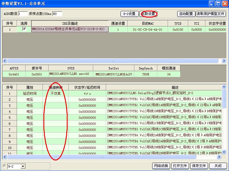 2)點擊上圖標題欄中“61850”按鍵,進入?yún)?shù)設(shè)置界面,選擇左下角“9-2”。