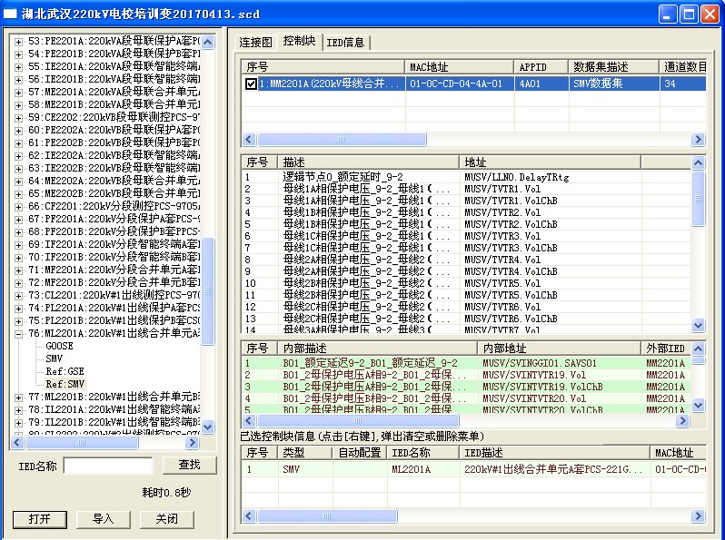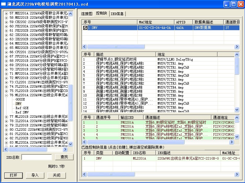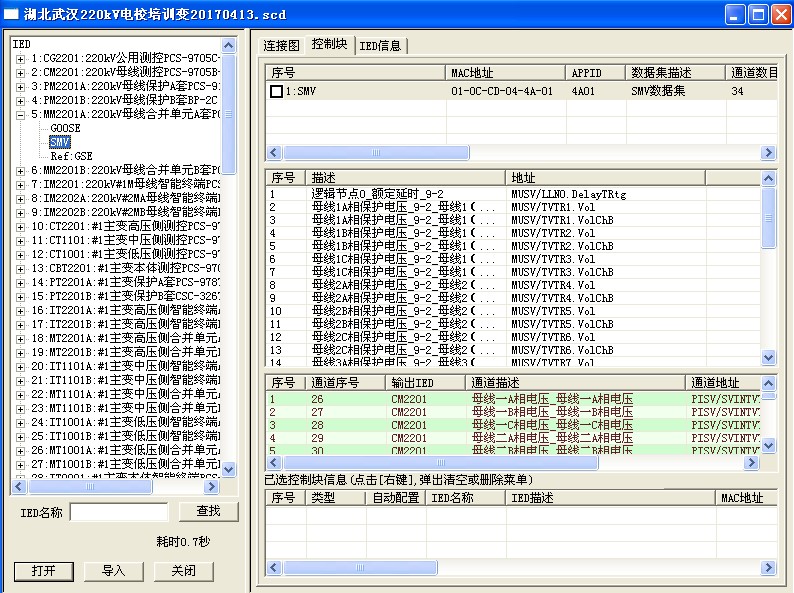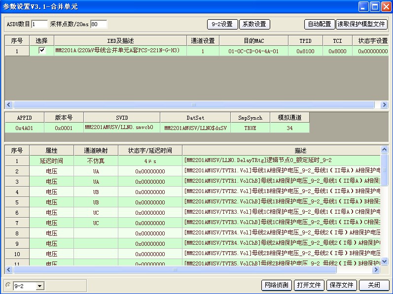此界面需要配置母線PT合并單元輸出的數(shù)字信號配置給繼保儀,點擊上圖右上角“讀取保護模型文件”導入此合并單元輸出SV控制塊。
