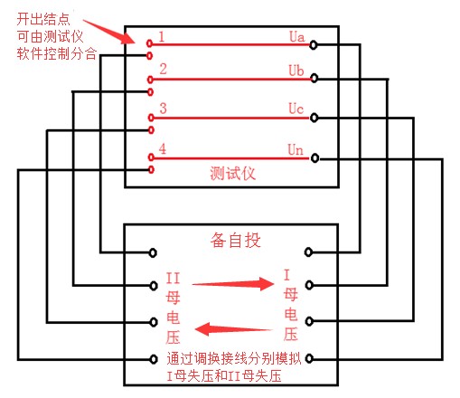 將Ua、Ub、Uc接入I母電壓輸入端子,在手持式繼保儀的電壓輸出端子并聯(lián)出一組電壓線,接在繼保儀的開出接點,再由繼保儀開出接點的另一端接入II母電壓。 此時 繼保儀的開出接點充當一個三相空開,可以由軟件控制分合,模擬II母有壓和失壓。 需 要模擬I母有壓、失壓時,將接在備自投裝置端子排的兩組電壓線調(diào)換即可。