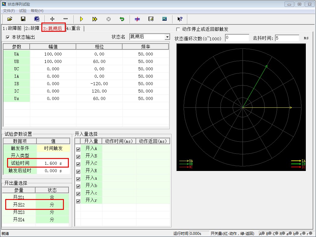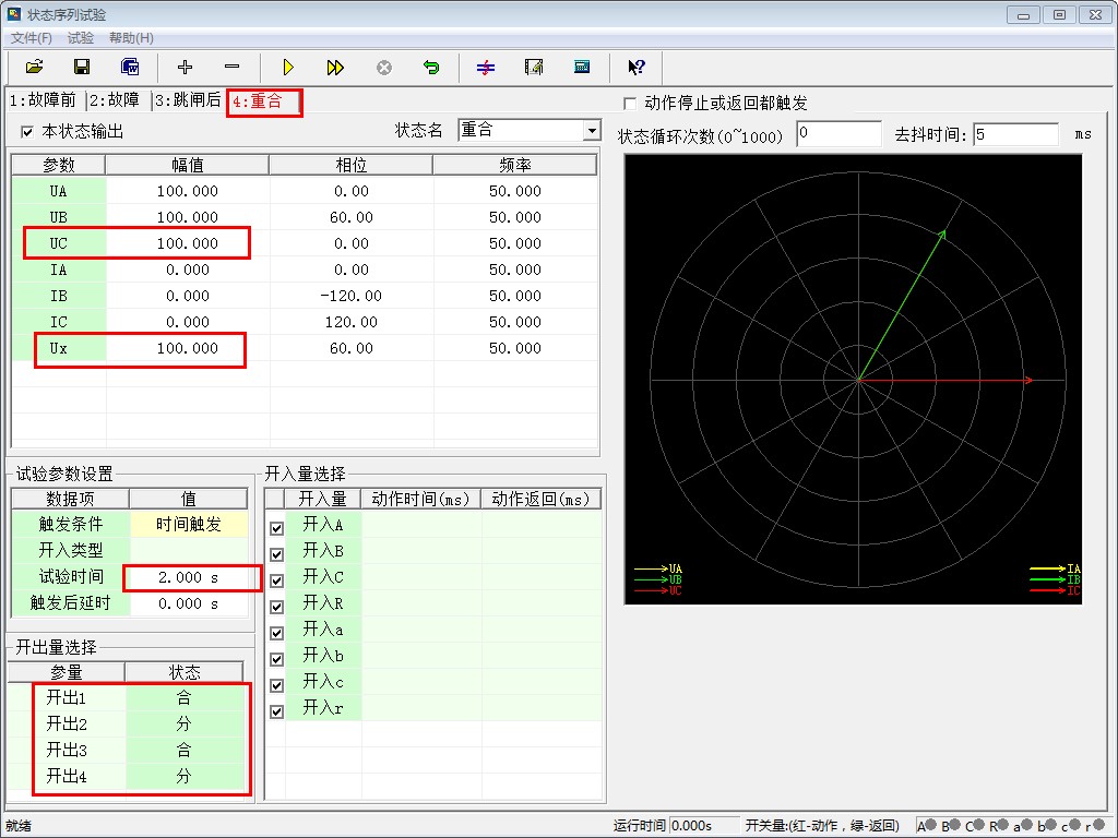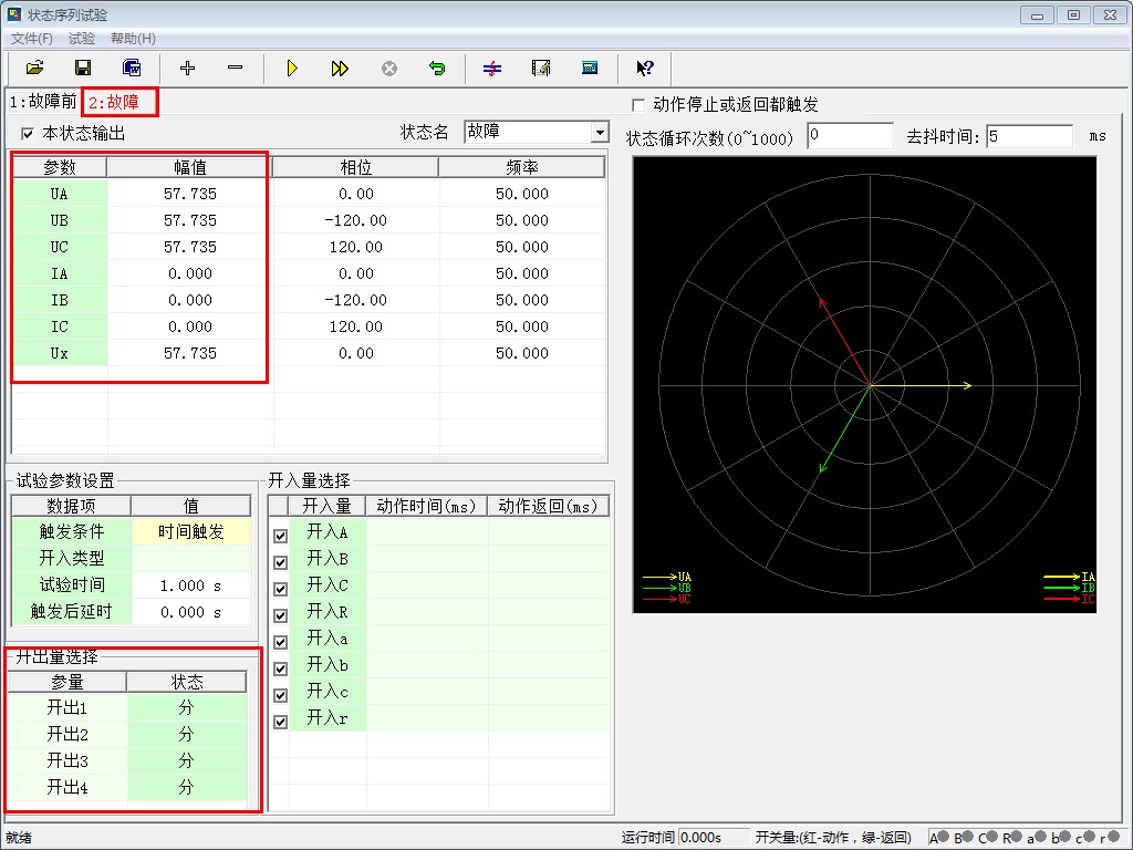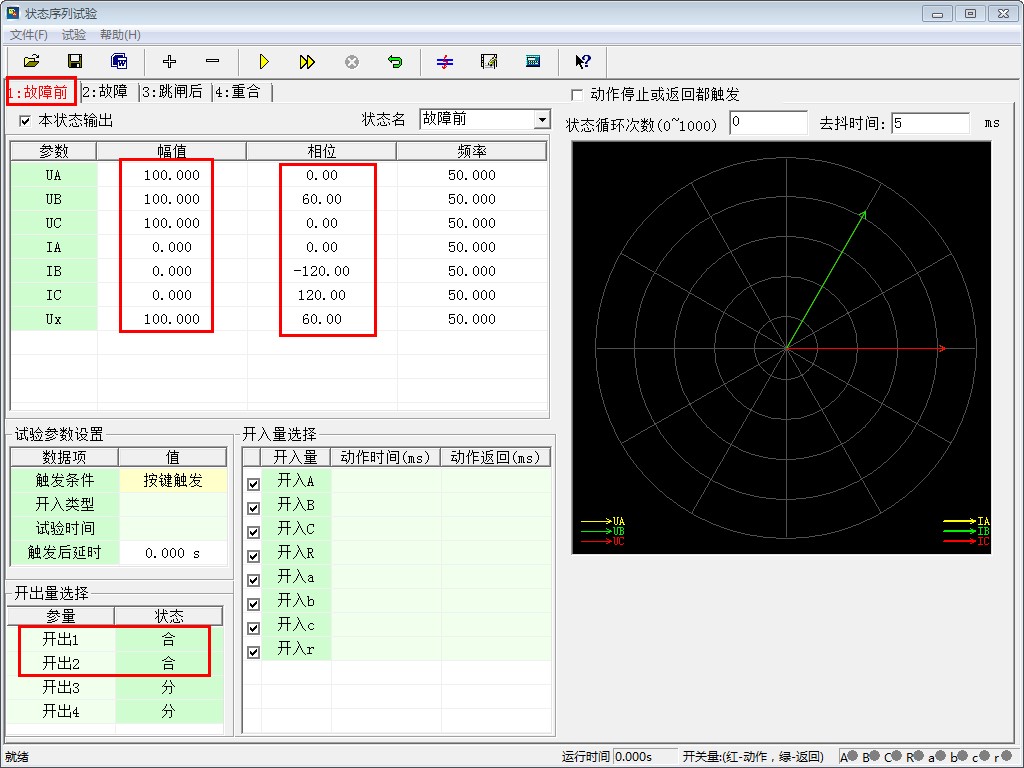 1)故障前。 UA和UB將模擬I母電壓,幅值均設(shè)置為100V、相位相差60°; UC和UX將模擬II母電壓,幅值均設(shè)置為100V、相位相差60°。 因 繼保儀的開出1、2分別接DL131、DL231的合位信號(HWJ),設(shè)置開出1、2狀態(tài)為閉合,表示進線DL131、DL231斷路器都處于合位。