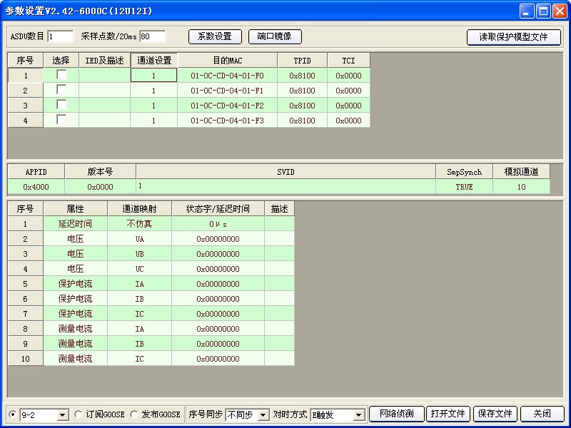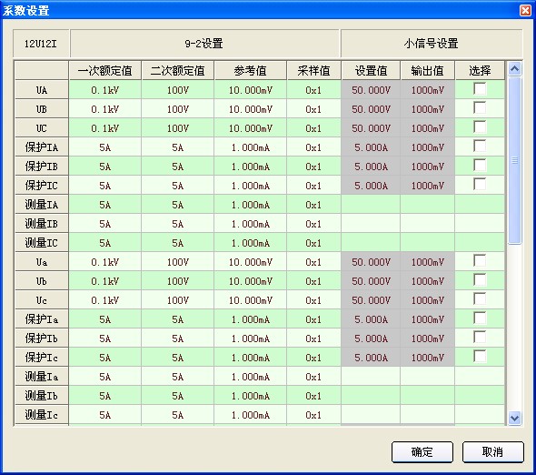 設(shè)置系統(tǒng)的一次額定值、二次額定值、參考值、采樣值和小信號信息, 輸出通道有UA、UB、UC、保護(hù)IA、保護(hù)IB、保護(hù)IC、測量IA、測量IB、測量IC、Ua、Ub、Uc、保護(hù)Ia、保護(hù)Ib、保護(hù)Ic、測量Ia、測量Ib、測量Ic和UU、UV、UW、保護(hù)IU、保護(hù)IV、保護(hù)IW、測量IU、測量IV、測量IW、Uu 、Uv、Uw、保護(hù)Iu、保護(hù)Iv、保護(hù)Iw、測量Iu、測量Iv、測量Iw共36路。