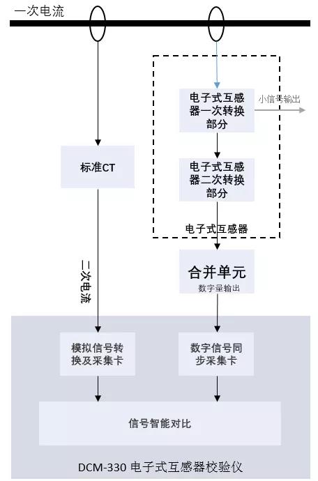 此次試驗(yàn)使用DCM-330 電子式互感器校驗(yàn)儀搭配標(biāo)準(zhǔn)電流互感器、電子式互感器進(jìn)行校驗(yàn)(接線原理圖如下)。