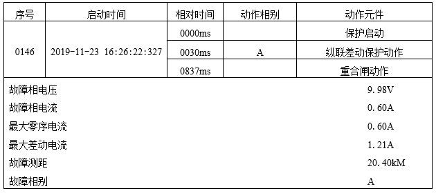 試驗(yàn)前需將通道1差動(dòng)軟壓板置“1”,對(duì)應(yīng)的差動(dòng)保護(hù)控制字和重合閘控制字置“1”,通道1光纖改為自發(fā)自收,本側(cè)對(duì)側(cè)識(shí)別碼改為一致,以模擬A相故障為例,測(cè)試動(dòng)作時(shí)間時(shí)差動(dòng)電流為1.2Id時(shí),試驗(yàn)步驟如下: