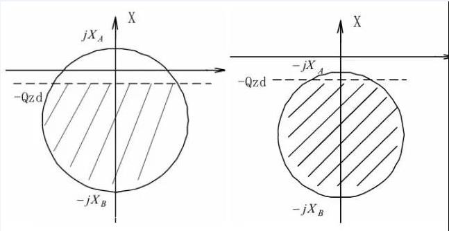 發(fā)電機定子側(cè)阻抗判據(jù)有兩種阻抗圓,異步阻抗圓或靜穩(wěn)邊界圓,動作方程為: ?
