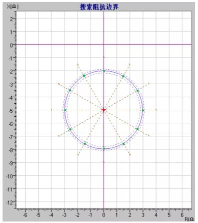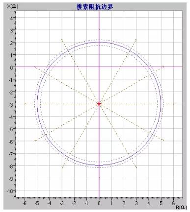 搜索中心: 根據(jù)定值可推算出中心為5Ω((8Ω+2Ω)/2=5Ω),角度為∠-90°,設(shè)置Z-Φ,軟件自動換算出R-X。