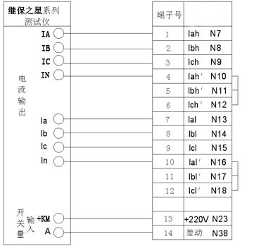 高壓側(cè)電流由繼保之星-7000A 的IA、IB、IC、IN接到保護(hù)裝置高壓側(cè)CT繞組,低壓側(cè)電流由測(cè)試儀Ia、Ib、Ic、In接到保護(hù)裝置低壓側(cè)繞組,將開(kāi)入量A接到保護(hù)裝置跳閘出口。