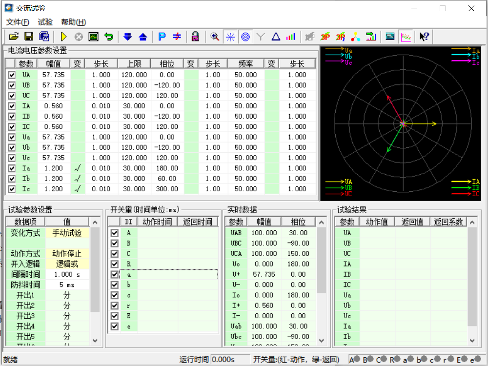 選擇交流試驗(yàn)?zāi)K,將六路電壓都設(shè)置為零,高壓側(cè)三相電流設(shè)置為0.56A,相序?yàn)檎?,步長(zhǎng)為零。 為保證初始狀態(tài)差動(dòng)保護(hù)可靠不動(dòng)作,低壓側(cè)三相電流設(shè)置為1.20A(此時(shí)Id<Ie,Ir>2Ie,在制動(dòng)區(qū)),相序?yàn)檎?,步長(zhǎng)為0.01A,變化方式為手動(dòng)試驗(yàn)。