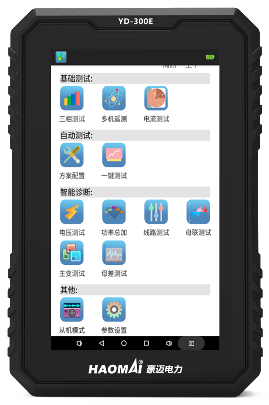作為一款先進的智能化多功能測試儀,YD-300E 包含測試主機和從機,主機自帶7寸電容觸摸屏,運行Android系統(tǒng),內置大容量鋰電池,通過U盤進行數據導入和導出,可實現功能包括: