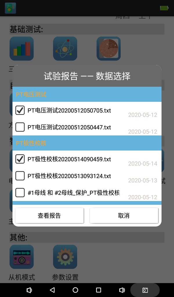 在主界面中,點擊智能診斷模塊,選擇生成報告,勾選對應試驗數據生成報告。 以電壓測試為例,選擇三個測試數據,點擊“查看報告”即可生成和查看報告。