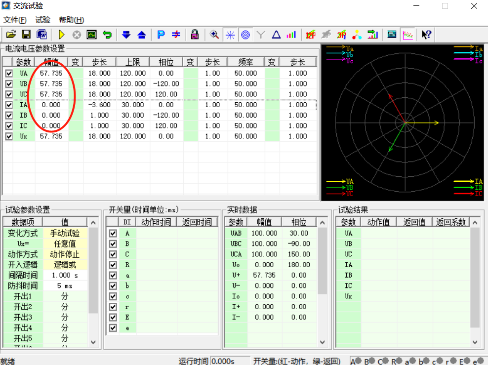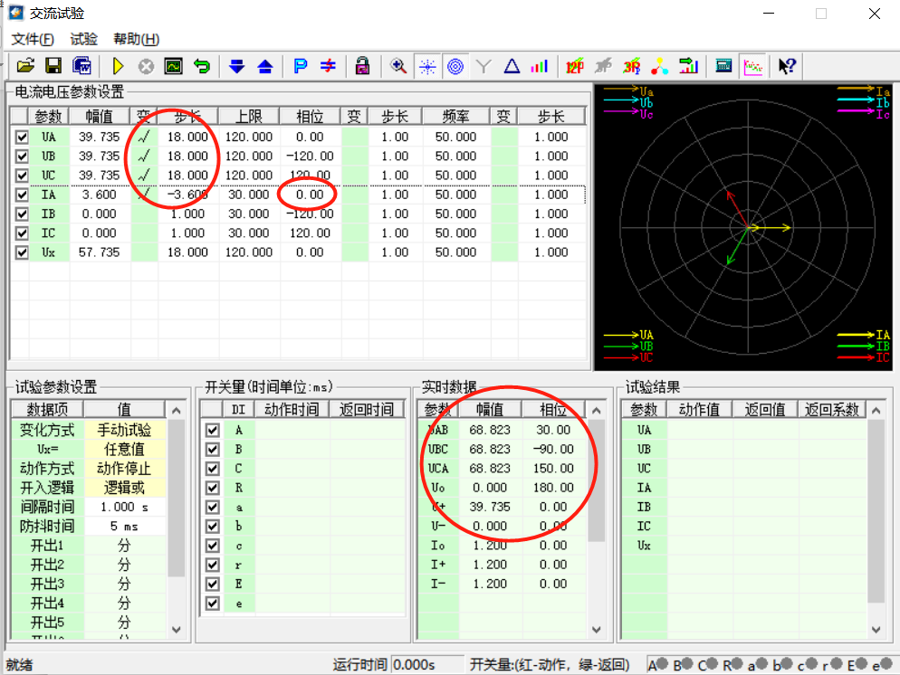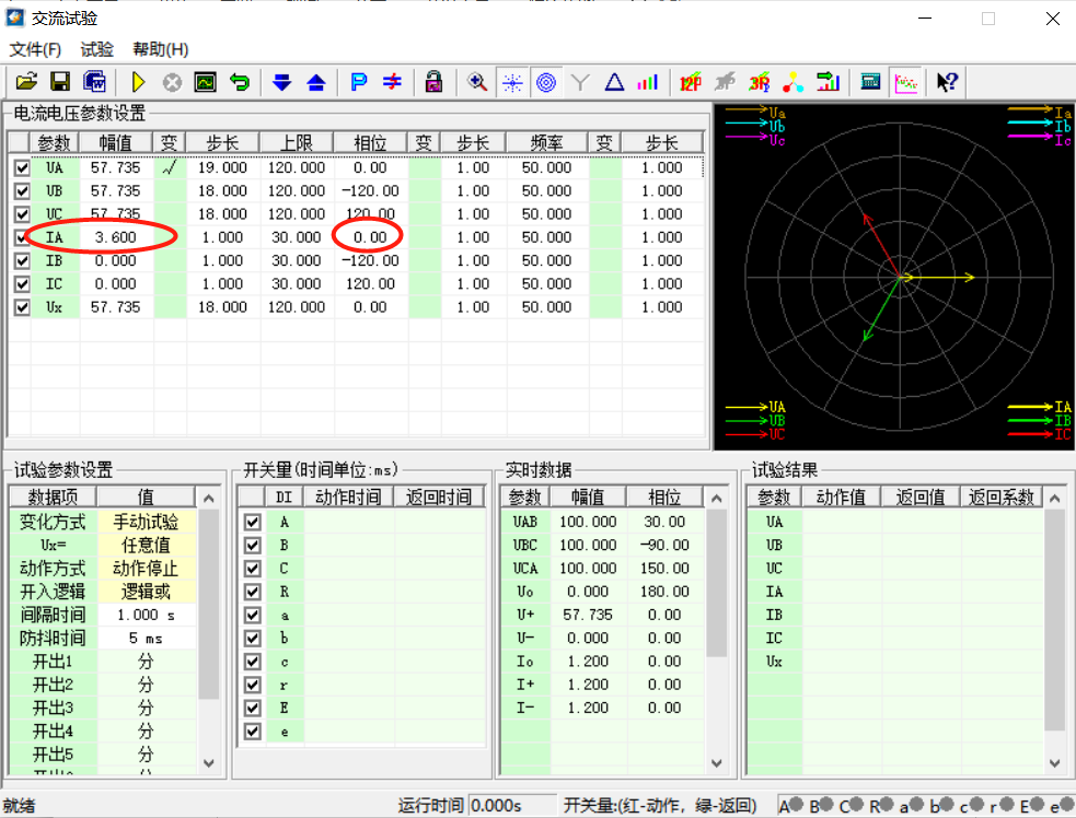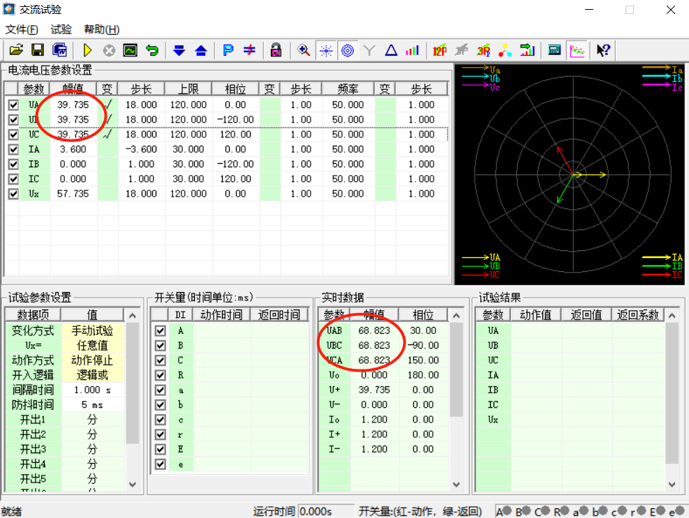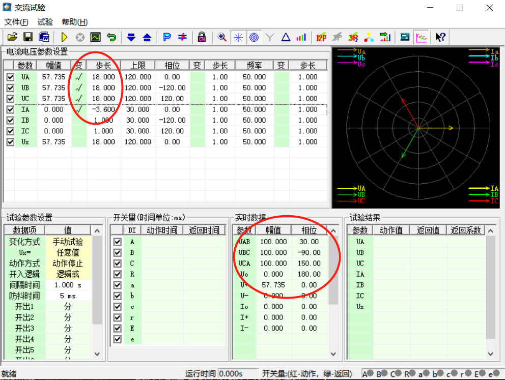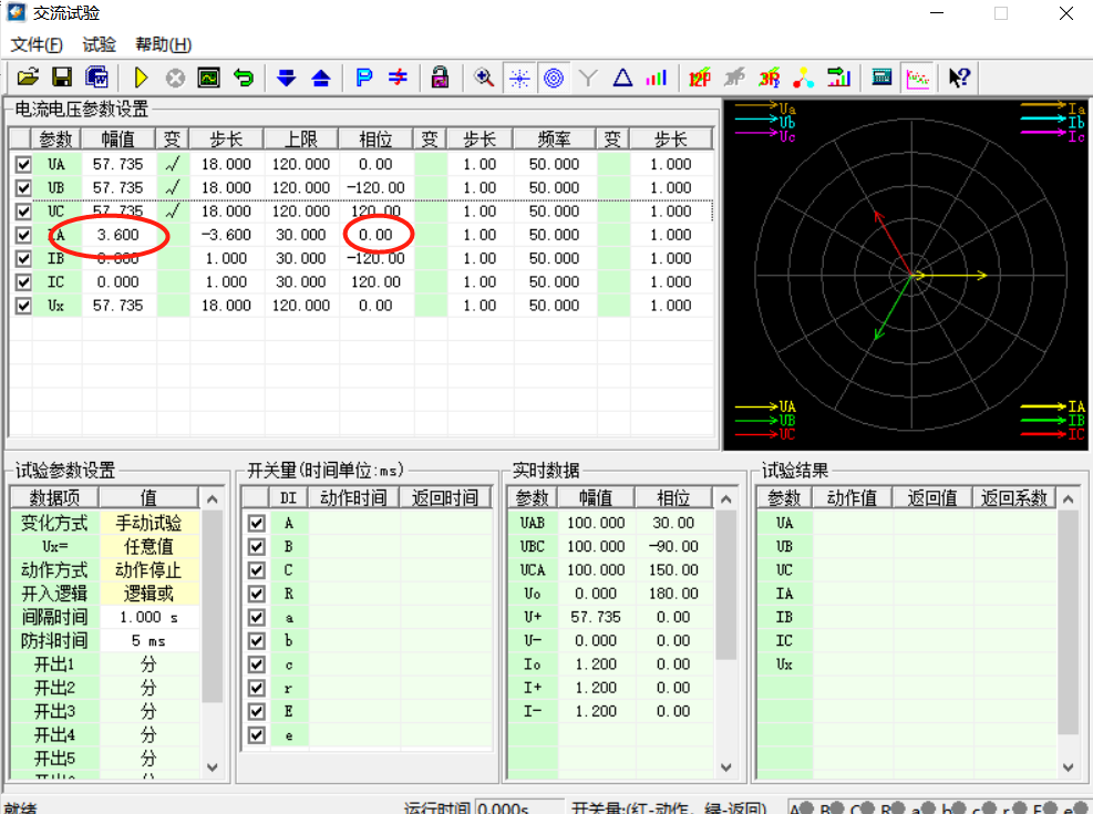模擬A相接地故障,IA故障相角度為0°,在動作區(qū)內(nèi)點(diǎn)擊向下箭頭進(jìn)入故障狀態(tài)。