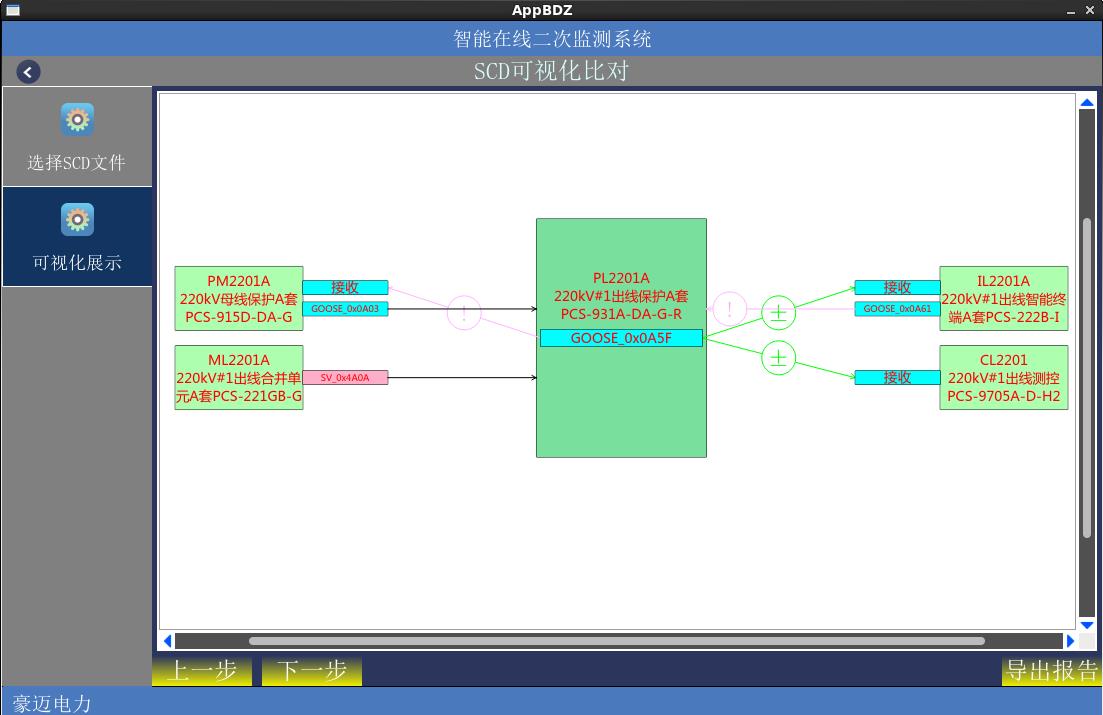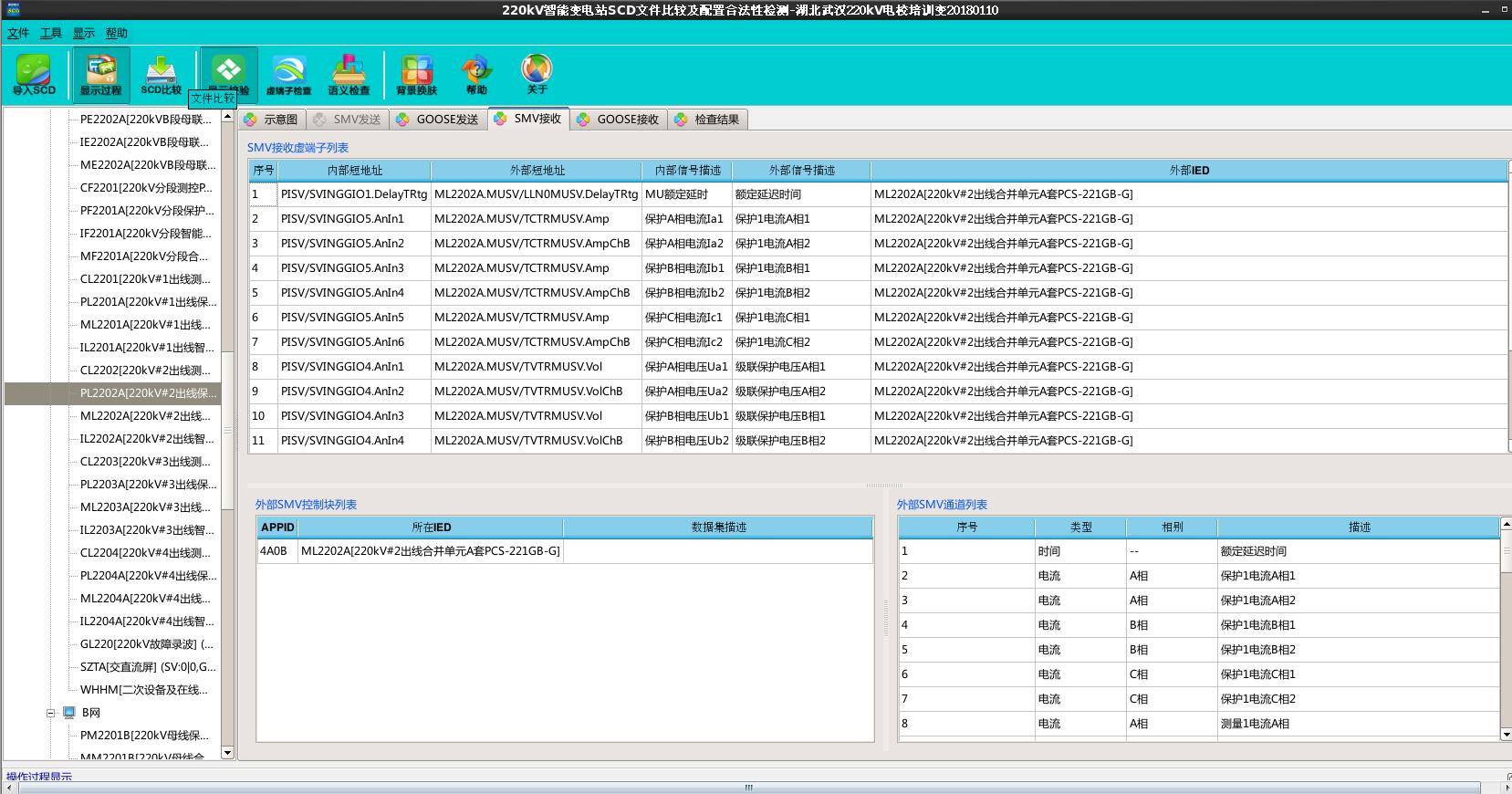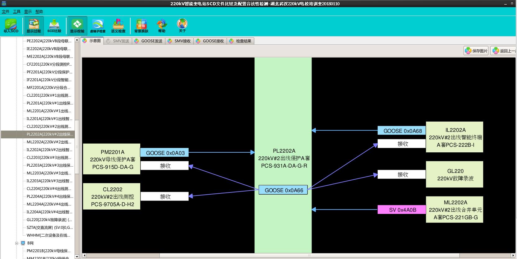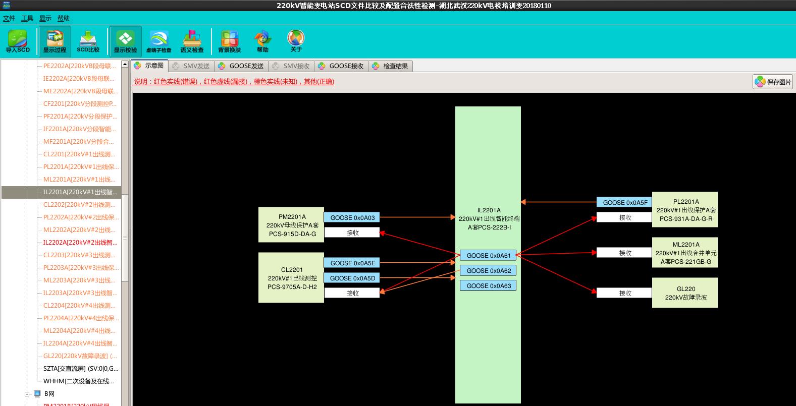該模塊基于快速的XML超大文件解析和基于圖論的關聯(lián)搜索的軟件算法對智能變電站SCD文件進行智能解析,結合220kV虛端子自查原則,利用模糊匹配原則,不僅可以方便快速實現(xiàn)對全站配置SCD文件虛端子合法性檢查,還可以可視化展示模型文件中各IED之間網(wǎng)絡連接、自動生成IED之間虛擬二次回路的邏輯連接圖。