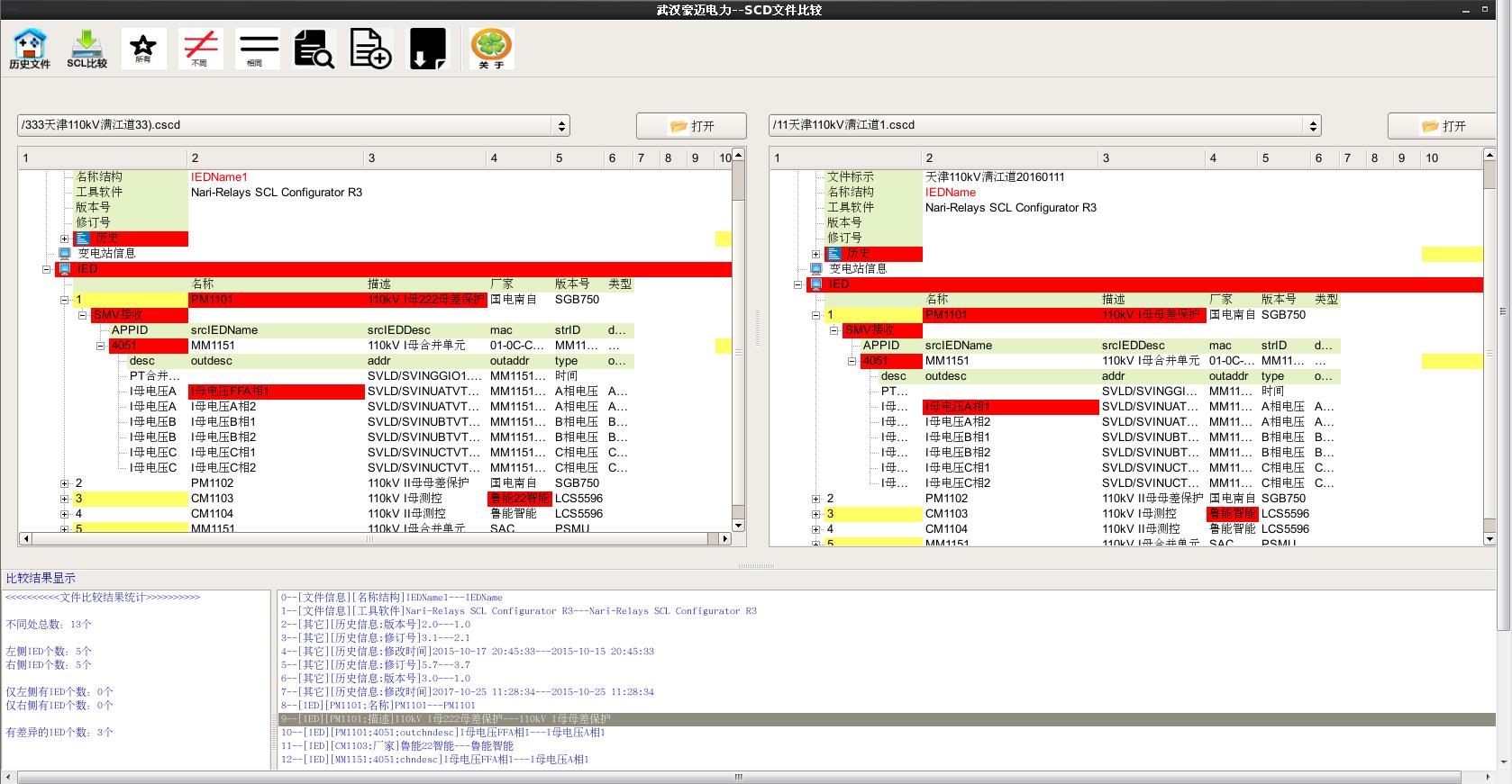 分為三級進行可視化展示,第一級是IED層級,紅色代表兩個SCD文件內(nèi)部存在差異。