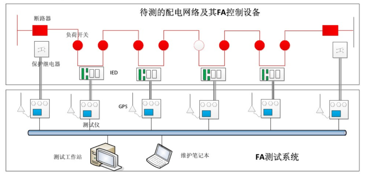 不停電狀態(tài)下,實(shí)現(xiàn)多點(diǎn)DTU/FTU/TTU終端的同步故障模擬,配合主站進(jìn)行故障區(qū)域判斷、故障隔離和供電恢復(fù)策略執(zhí)行,實(shí)現(xiàn)完整的饋線(xiàn)自動(dòng)化(FA)功能測(cè)試;