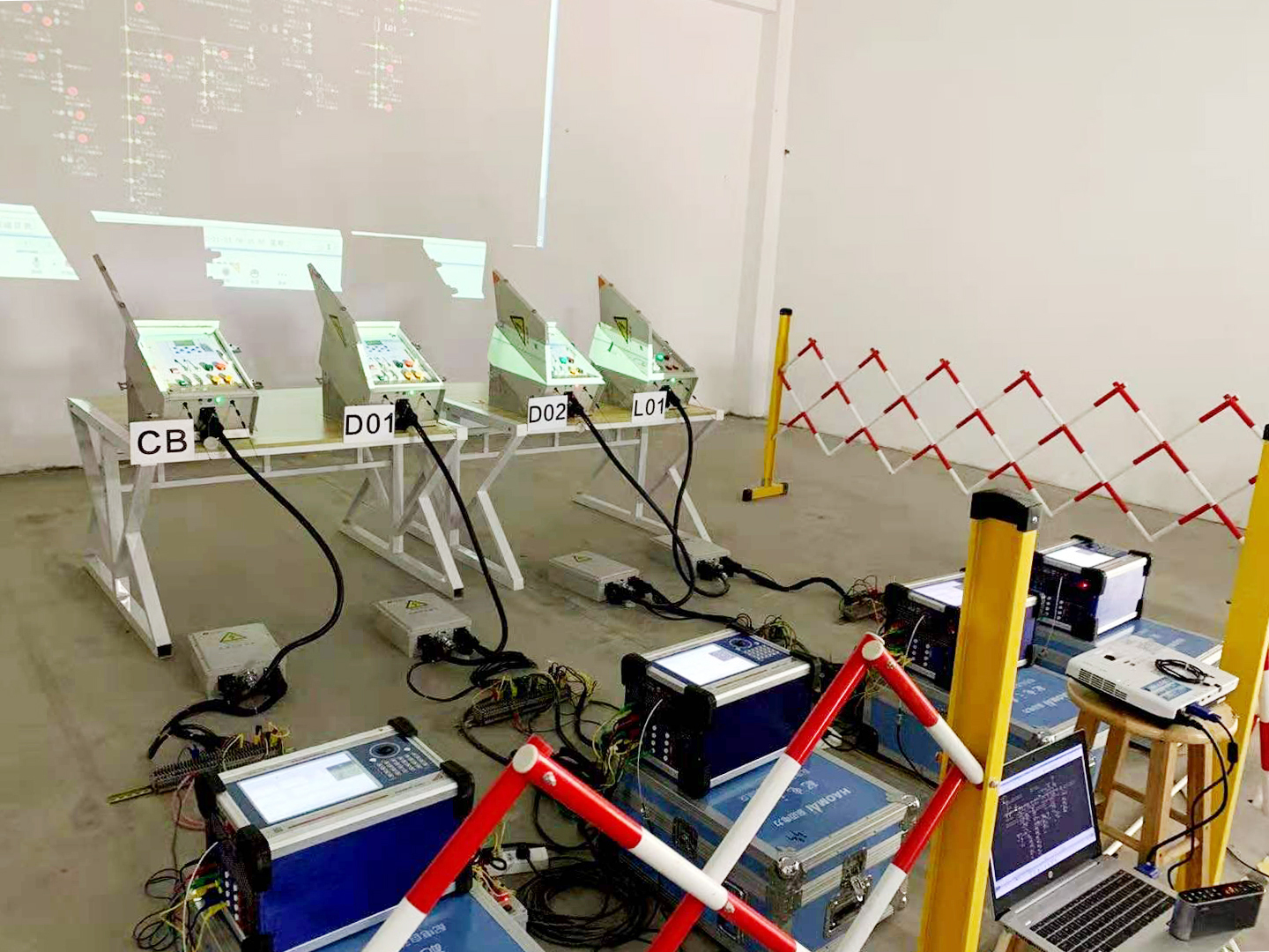 此次試驗以四臺送檢終端進行演示,1臺模擬變電站開關(guān)CB,2臺為主干線開關(guān)DO1、DO2,1臺為聯(lián)絡(luò)開關(guān)L01。 武漢豪邁電力提供4臺配電之星-P2200 配電自動化終端測試儀,分別與變電站的出線開關(guān)CB、分段開關(guān)DO1、DO2、聯(lián)絡(luò)開關(guān)L01通過前端采集工裝連接(采集工裝主要負責終端裝置電流電壓開關(guān)量的采集)。 WDS-3 配電開關(guān)模擬試驗盒替代一次開關(guān)模擬開關(guān)的合閘分閘動作及合位分位的信號狀態(tài)。 每臺配電之星-P2200 通過GPS對時方式保證同步性。 根據(jù)不同的故障點和各開關(guān)節(jié)點的不同狀態(tài),使用配電之星-P2200 分別對各開關(guān)節(jié)點輸出不同的模擬量、開關(guān)量、開入量,模擬各開關(guān)在不同故障的狀態(tài),實現(xiàn)模擬饋線故障時狀態(tài)。 試驗輸出過程中觀察各開關(guān)位置狀態(tài)機上送給主站的信息,判斷FA動作是否正確,完成就地FA測試,大大減輕工作強度,提高檢測效率。