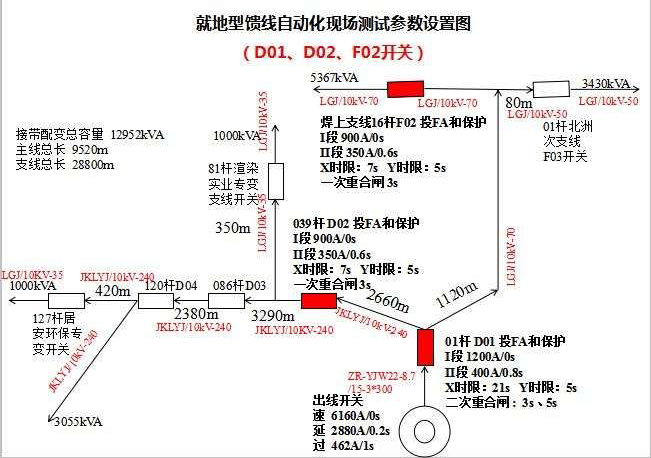 本次在220kV變電站10kV配電線路進行就地型饋線自動化測試,線路的保護配置及FA參數(shù)見下圖。 選取D01、D02、F02三個開關(guān)進行現(xiàn)場FA策略認證,現(xiàn)場驗證采取不停電作業(yè),將終端一次開關(guān)與終端航插線斷開,采用備用一次開關(guān)進行模擬,使用配電之星-P2200? 進行故障模擬。