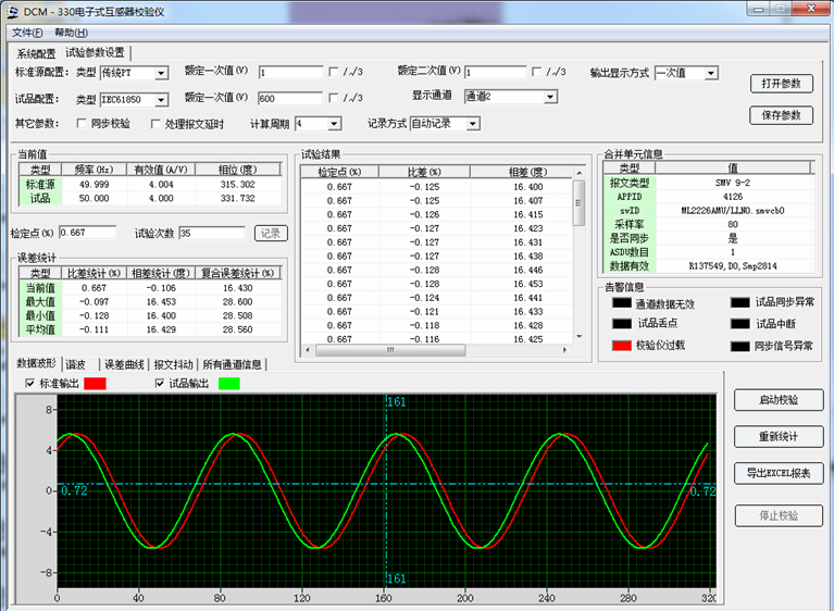 DCM-330 電子式互感器校驗儀信號處理程序采用高精度算法和頻率跟蹤處理,對各種規(guī)范的解碼具有通用性,能夠根據(jù)被校通道數(shù)據(jù),進行數(shù)據(jù)分析,通過綜合處理得到被校設備的比差、角差、頻率等指標,同時完成波形繪制,并將指標保存為表格。