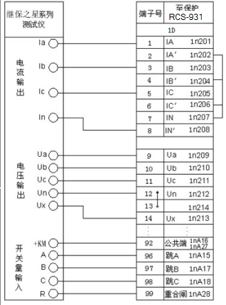 將繼保之星-S60 的電壓輸出端“Ua”、“Ub”、“Uc”、“Un”分別與保護(hù)裝置的交流電壓“Ua”、“Ub”、“Uc”、“Un”端子相連。