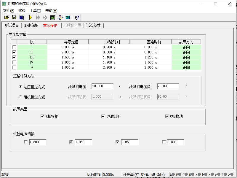 點(diǎn)擊開始圖標(biāo)或按鍵盤上的“運(yùn)行”“確認(rèn)”鍵,繼保之星-S60 開始輸出(做距離保護(hù)時提示打開零序保護(hù)壓板,做零序保護(hù)時提示打開距離保護(hù)壓板),先輸出空載狀態(tài),然后再輸出故障狀態(tài),直到保護(hù)可靠跳閘,開入接點(diǎn)采集到動作時間,繼保之星-S60 自動繼續(xù)后面的試驗直至完成所有保護(hù)試驗并結(jié)束試驗,根據(jù)提示選擇是否保存試驗結(jié)果。