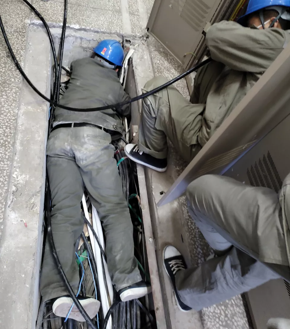 △ 保護(hù)屏柜孔洞被電纜擋住,施工人員趴在電纜溝里牽引電纜