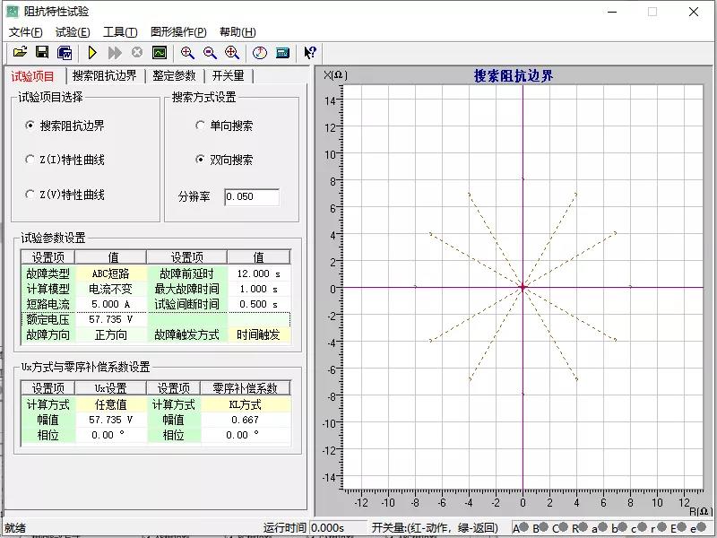 搜索中心為定值的一半,為2Ω,正序阻抗角78°,搜索半徑要大于定值的一半,可設置為3Ω。 角度步長決定了搜索點的多少,步長越小搜索的點越多,精度越高,耗時越久,步長越大搜索的點越少,精度相對低,耗時較短。 建議設置步長30°,搜索線數(shù)12條。