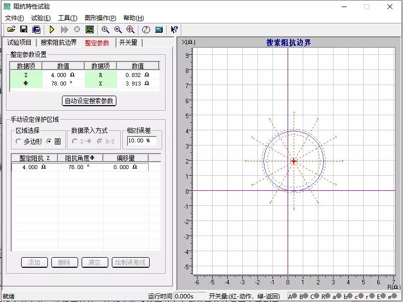 此處設定整定值,選擇圓特性,填寫參數(shù)后在右側的阻抗邊界圖中觀察邊界曲線。 實線圓表示理論特性圓,虛線圓表示10%的誤差范圍。