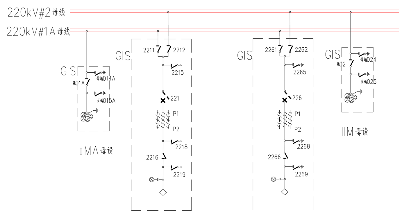 2)由于各一次設備不能在GIS內(nèi)部接線,考慮電流電壓從兩間隔的進出線引線側(cè)接入,電流選取226開關間隔,將電流從226引線處接入,經(jīng)隔刀2266流過CT再經(jīng)開關226流過,最終由地刀2265流入大地形成電流回路。