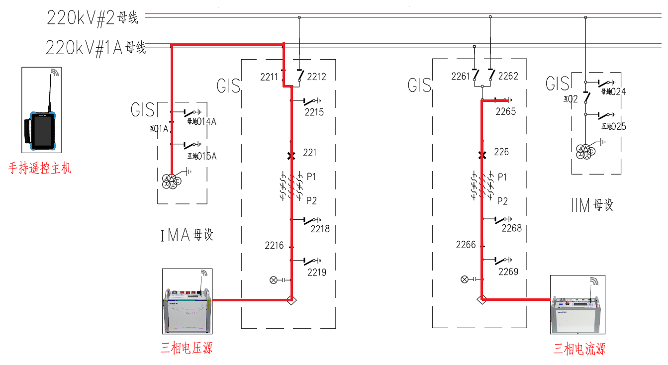 1)該站一次設備采用全封閉式GIS結(jié)構,下圖為選取的兩個試驗間隔以及母設示意圖。