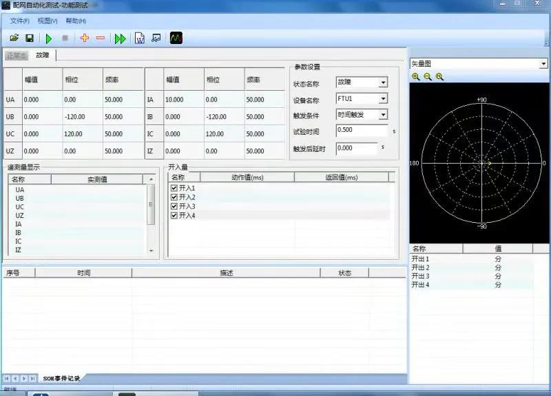 4)使用配電自動化終端測試儀對環(huán)網(wǎng)柜DTU內(nèi)主1、分1開關電流端子側注入故障電流,用FA虛擬終端測試系統(tǒng)模擬出線開關跳閘和出線開關故障電流。