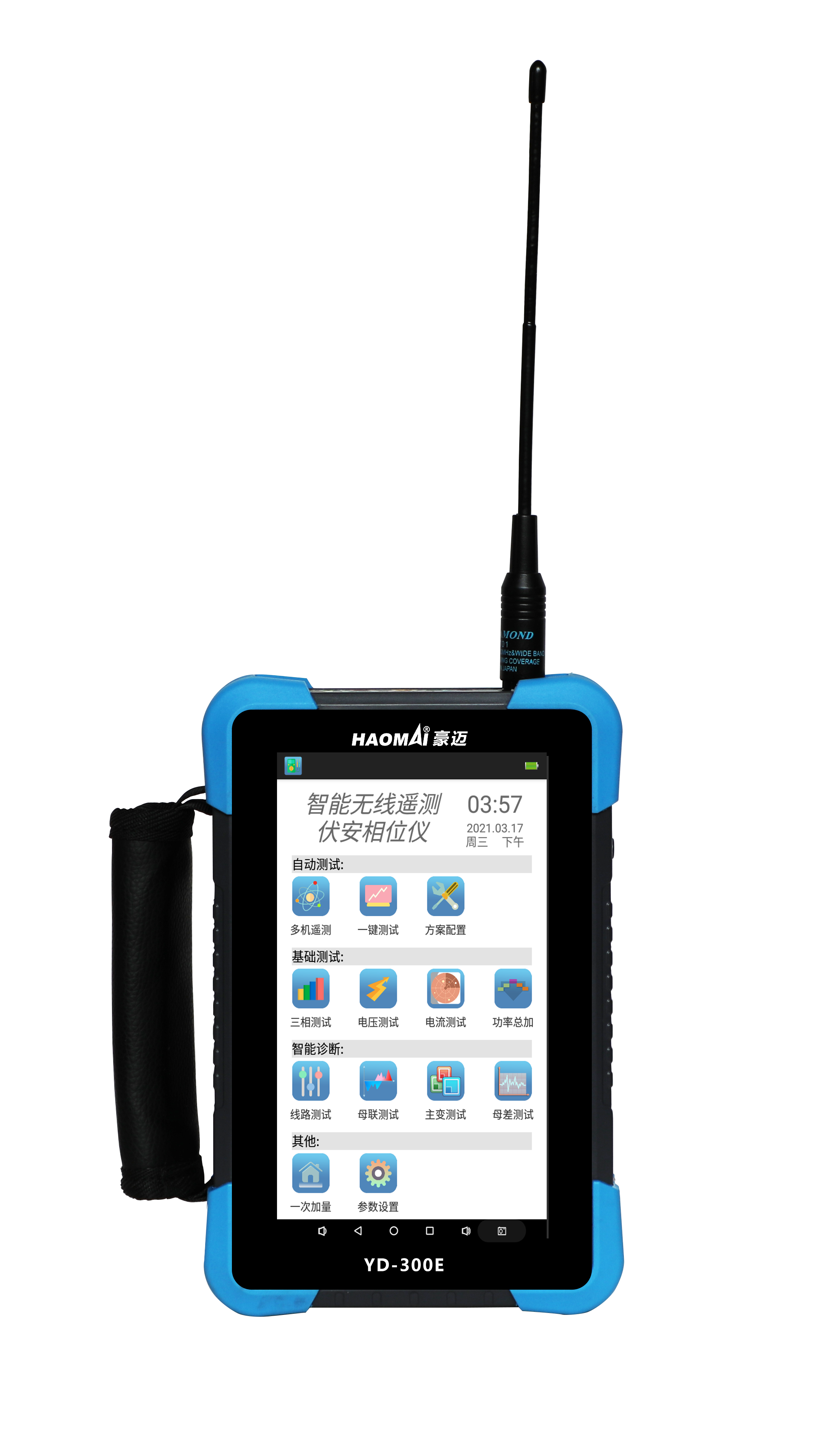根據(jù)電力系統(tǒng)變電站二次測試需求,特別是智能變電站二次模擬量分布測量需求,武漢豪邁自主研發(fā)了智能化多功能測試儀YD-300 無線遙測伏安相位儀,由測試主機和從機兩部分組成。