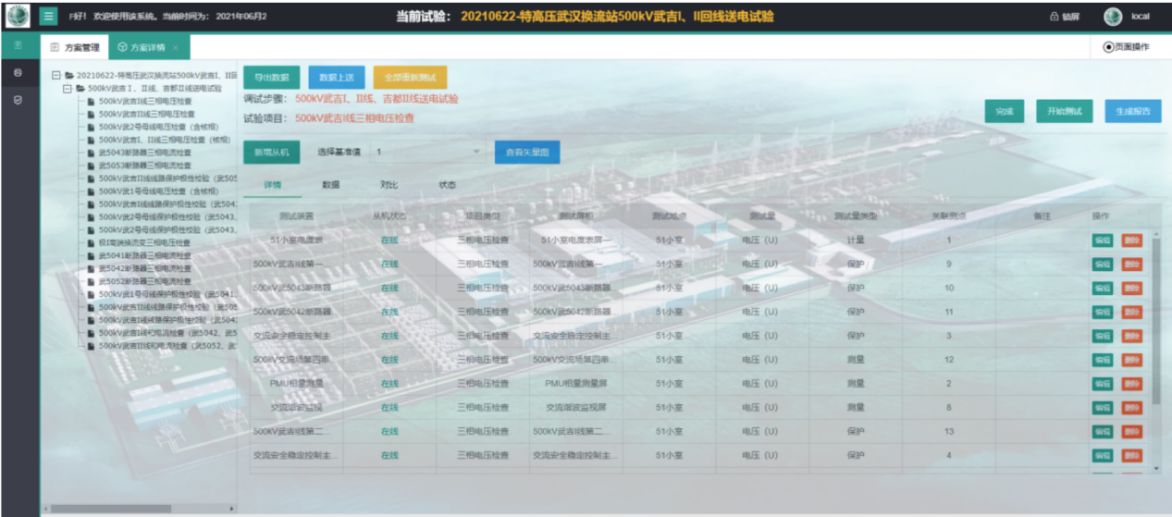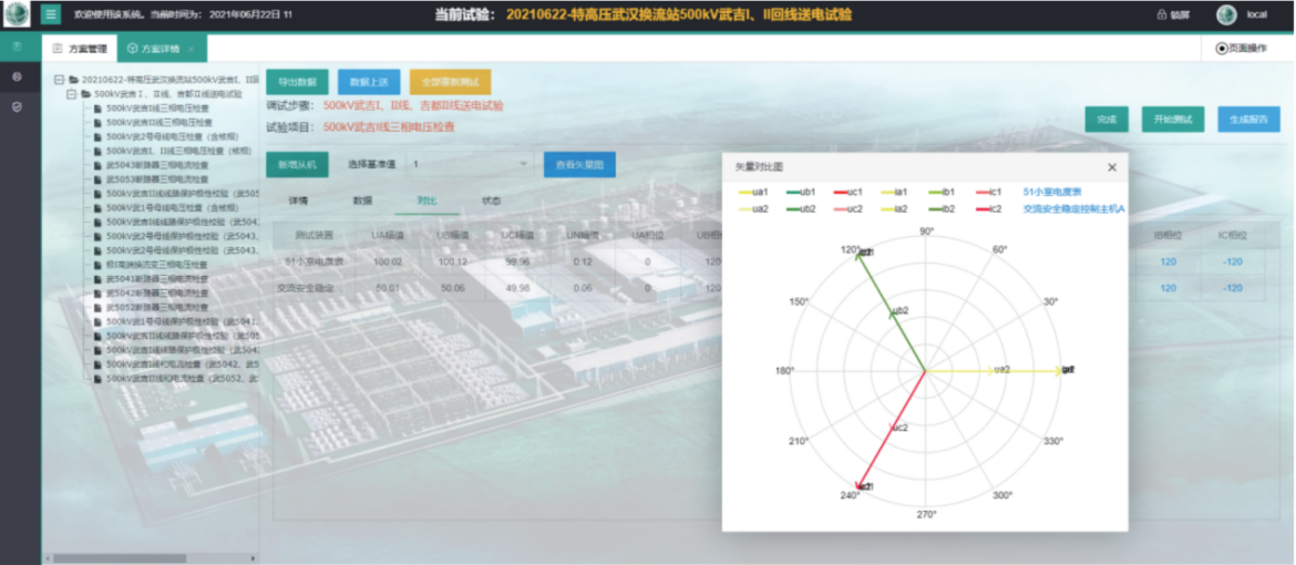 通過多點YD-300 后 臺系統(tǒng)對試驗方案進行統(tǒng)一管理,包括方案導入導出、數(shù)據(jù)同步上送、查看編輯等。 點擊進入具體試驗方案,選擇試驗內(nèi)容、測試裝置初始參數(shù)以及從機狀態(tài)。 點擊開始測試后,實時更新參數(shù),也可勾選其中兩項進行差異對比可視化。 查看雷達矢量圖可直觀顯示幅值相位大小。 基準值的設定和一鍵校準功能減少計算誤差,設置合理誤差范圍。 變比管理控制高低壓側數(shù)值轉化,進行合理輸出。 通過數(shù)據(jù)上送同步服務端的數(shù)據(jù)信息。