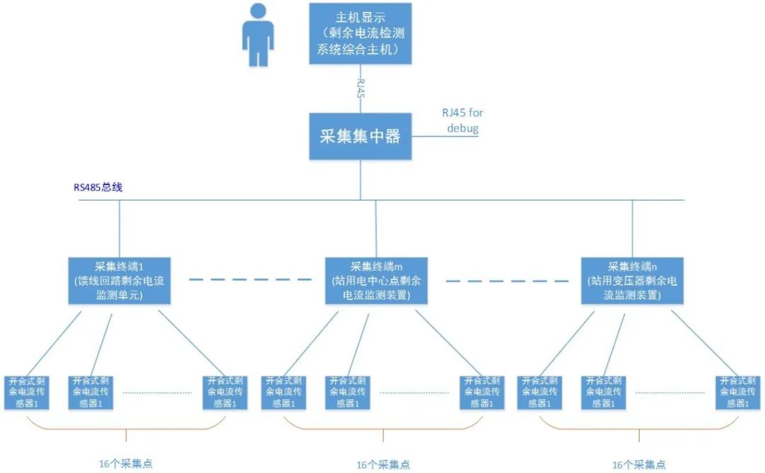 系統(tǒng)由剩余電流采集終端、剩余電流集中器、剩余電流監(jiān)測(cè)系統(tǒng)主機(jī)三部分組成。