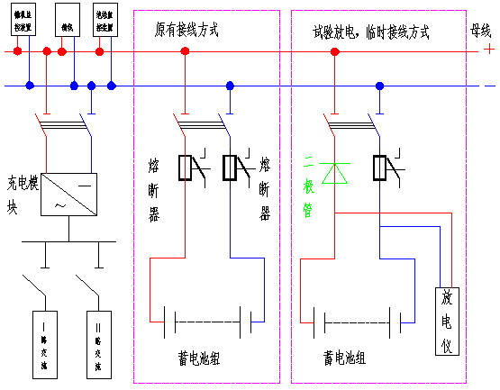 圖中試驗(yàn)放電、臨時(shí)接線方式中取下蓄電池正極熔斷器,利用大功率二極管正負(fù)極取代蓄電池正極熔斷器位置(二極管正極接熔斷器下端,負(fù)極接熔斷器上端,注意極性不能接反),蓄電池組總正負(fù)極連接FDT-220/110 直流系統(tǒng)綜合測試儀。 電池組放電過程中,由于二極管的單向逆止作用,直流屏上的充電模塊不能對蓄電池組進(jìn)行充電。 試驗(yàn)過程中,若是出現(xiàn)直流屏輸入交流電源斷電或是高頻充電模塊故障,試驗(yàn)中的蓄電池仍可以向直流饋線屏供電,避免充放電試驗(yàn)過程中直流電源失壓。