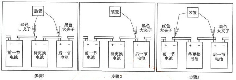 確定待換蓄電池的正負(fù)極性,按照裝置的使用說明依次操作。 一般將黑色夾子固定在待換電池負(fù)極相連的相鄰蓄電池正極,紅色夾子固定在待換電池正極相連的相鄰蓄電池負(fù)極。 檢查無誤,將待換電池拆除,換上新的蓄電池,恢復(fù)蓄電池連接條。