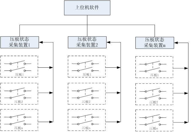 帶輔助接點(diǎn)的硬壓板外設(shè)輔助觸點(diǎn)可等效為一個(gè)接點(diǎn)。 壓板狀態(tài)監(jiān)測(cè)模塊一方面采集這些接點(diǎn)的狀態(tài),一方面集中上傳這些接點(diǎn)的狀態(tài)至上位機(jī)。 通過輔助接點(diǎn)的硬開出信號(hào)和上位機(jī)返回的報(bào)文確認(rèn)硬壓板的狀態(tài),實(shí)現(xiàn)“雙確認(rèn)”。
