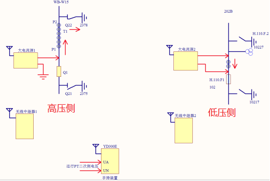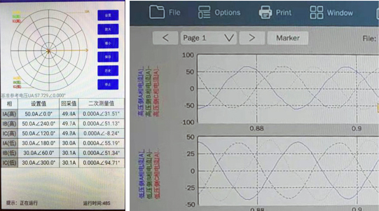 通過(guò)YD-300 遙控大電流源1和大電流源2同步輸出電流,在保護(hù)裝置上查看高壓側(cè)和低壓側(cè)電流幅值和相位是否與設(shè)置值一致,若一致則在高壓側(cè)和低壓側(cè)加相位相反的電流,查看差流是否正確,依此判斷極性。