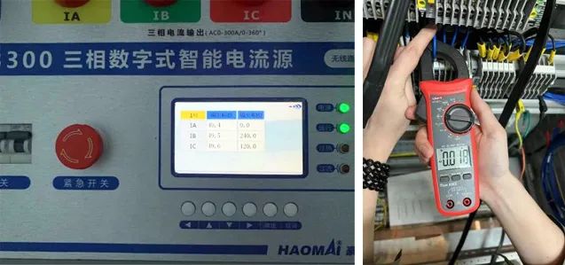 此時(shí)用鉗表在二次側(cè)測(cè)到高壓側(cè)的二次電流幅值,可以看出高壓側(cè)輸出與變比正常,再進(jìn)行低壓側(cè)手動(dòng)模式加量。