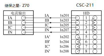 將繼保之星-Z70 的電流輸出端“Ia”、“Ib”、“Ic”分別與保護裝置的交流電流“IA”、“IB”、“IC”(極性端)端子相連;
