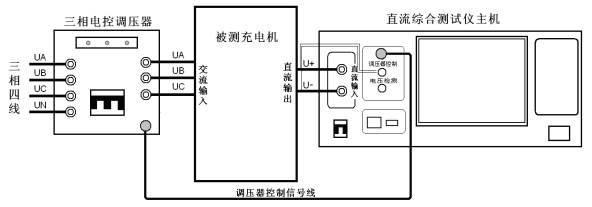 三相電控調(diào)壓器串入三相四線電源與被測充電機輸入之間,調(diào)壓器輸出接入被測充電機的輸入,調(diào)壓器控制信號線連接調(diào)壓器與主機,實現(xiàn)主機對調(diào)壓器的自動控制。