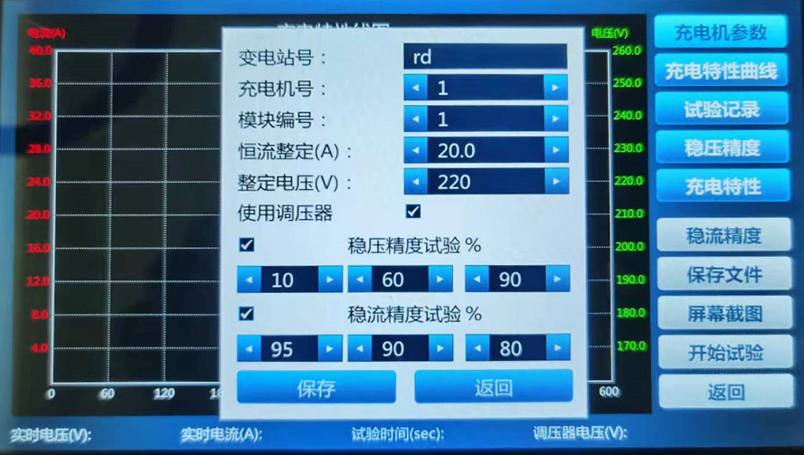主界面點擊充電機特性試驗,進行充電機參數(shù)設(shè)置。根據(jù)現(xiàn)場情況設(shè)置變電站號、充電機號、模塊編號。