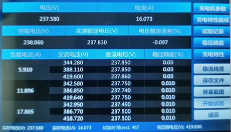 負載電流為之前設(shè)置的三個電流點,交流電壓為調(diào)壓器的輸出值,直流電壓為對應(yīng)條件輸出的直流電壓,測試儀根據(jù)實測數(shù)據(jù)自動計算出穩(wěn)壓精度。