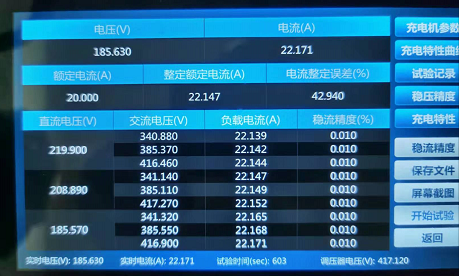 此次試驗接入了調(diào)壓器,勾選使用調(diào)壓器,在穩(wěn)壓精度與穩(wěn)流精度試驗中,裝置將自動調(diào)節(jié)至額定交流輸入電壓的85%、100%、115%。