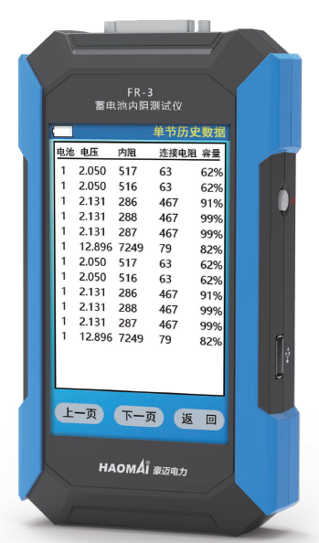 FR-3 蓄電池內(nèi)阻測(cè)試儀 支持對(duì)單節(jié)/整組蓄電池的內(nèi)阻和容量測(cè)試分析。 可以快速測(cè)試蓄電池內(nèi)阻、電壓,對(duì)單節(jié)電池進(jìn)行測(cè)試或?qū)φM電池進(jìn)行逐節(jié)連續(xù)測(cè)試,永久存儲(chǔ)999組電池參數(shù)。 上位機(jī)數(shù)據(jù)管理軟件提供數(shù)據(jù)管理、打印、分析、自動(dòng)生成報(bào)告等功能。