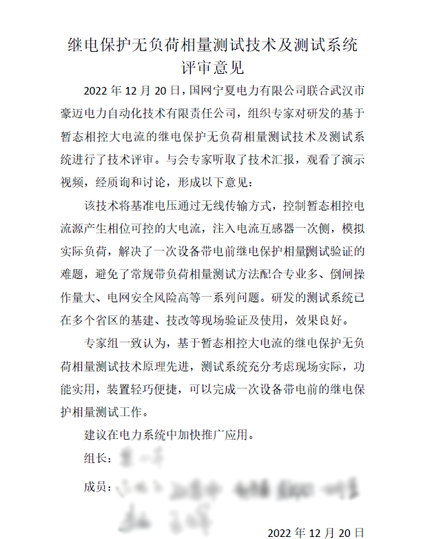 2022年12月20日,國網(wǎng)寧夏電力有限公司聯(lián)合武漢市豪邁電力自動化技術(shù)有限責任公司組織專家對研發(fā)的基于暫態(tài)相控大電流的繼電保護無負荷相量測試技術(shù)及測試系統(tǒng)進行了技術(shù)評審。