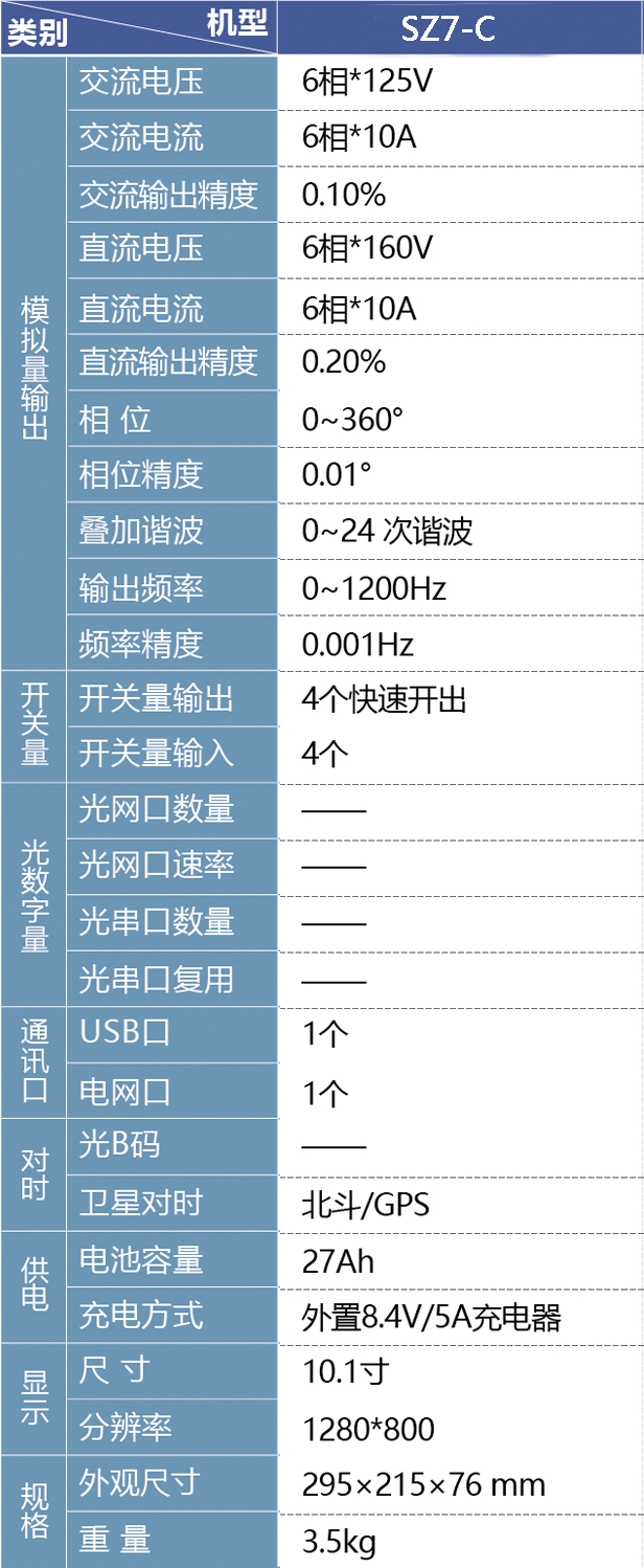 SZ7-C 二次儀表是具備6相電壓6相電流高精度輸出,可輸出高精度可控電流與電壓,主要用于變電站二次系統(tǒng)保護、測控、合并單元、智能終端等設備功能性能測試。該設備支持北斗、GPS、B碼對時,多機同步輸出。