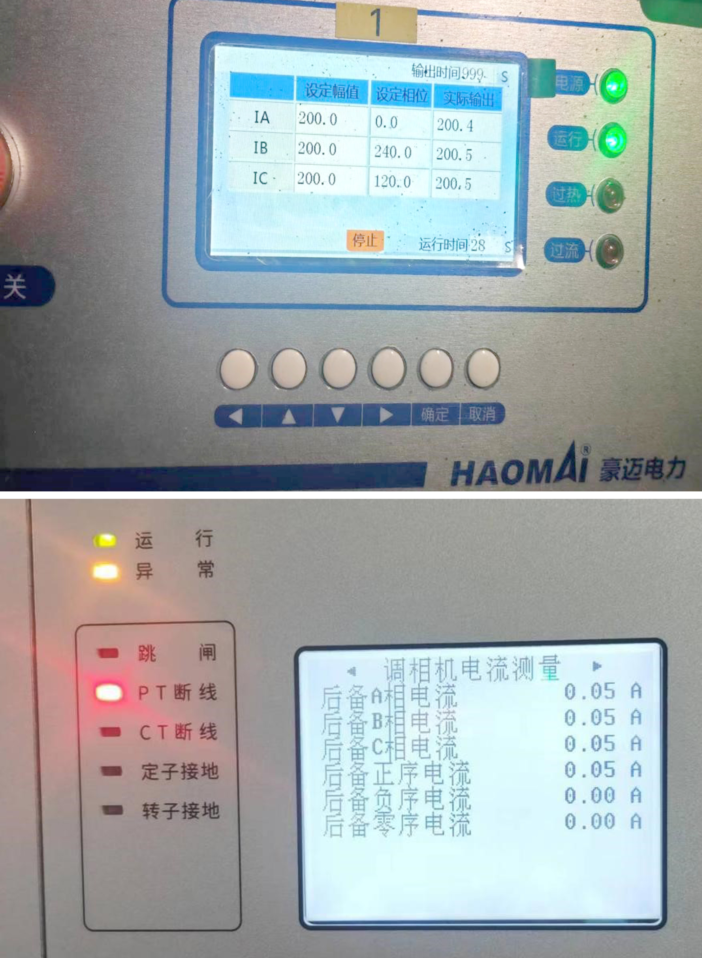 在調(diào)相機保護裝置6個穿芯CT加電流。