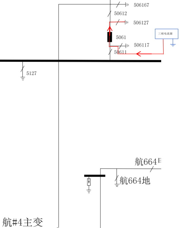 拆除500kV 5061主變間隔接地閘刀(506117閘刀)的接地連接點,試驗前需要斷開其它電流流經(jīng)回路的接地連接點,保證只有500kV #4主變間隔接地閘刀(506127閘刀)的一個接地連接點,從拆除點位置(506117閘刀)引線處用線纜依次與HTA-3300 三相數(shù)字式智能大電流源的A、B、C三相輸出端子連接,大電流源的N線與接地銅排連接(下圖中紅線為三相電流回路流向,開關(guān)、閘刀狀態(tài)如圖)。 506117、5061、506127在合閘位置,其他與500kV母線連接的隔刀均斷開,其余刀閘及地刀均在分閘位置。
