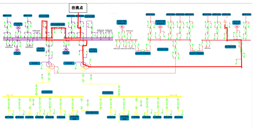 本方式使用電壓法通過220kV側(cè)長橋44A6間隔、220kV副母Ⅰ、220kV副母分段、220kV副母Ⅱ、220kV #2母聯(lián)、220kV正母、及1號(hào)主變高、中壓側(cè)向110kV母線注流,并通過出線待用1GQⅠ間隔線路側(cè)接地刀閘接地形成回路。 試驗(yàn)電流依次通過220kV側(cè)長橋44A6間隔、220kV副母Ⅰ、220kV副母分段、220kV副母Ⅱ、220kV #2母聯(lián)、220kV正母、1號(hào)主變高、中壓側(cè)、110kV Ⅰ母線、待用1GQⅠ間隔接地。